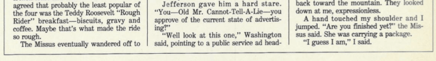There were four choices, of course, and I picked the Jefferson, which consisted of french toast and coffee. The Missus and I agreed that probably the least popular of the four was the Teddy Roosevelt “Rough Rider” breakfast – biscuits, gravy and coffee. Maybe that’s what made the ride so rough.
