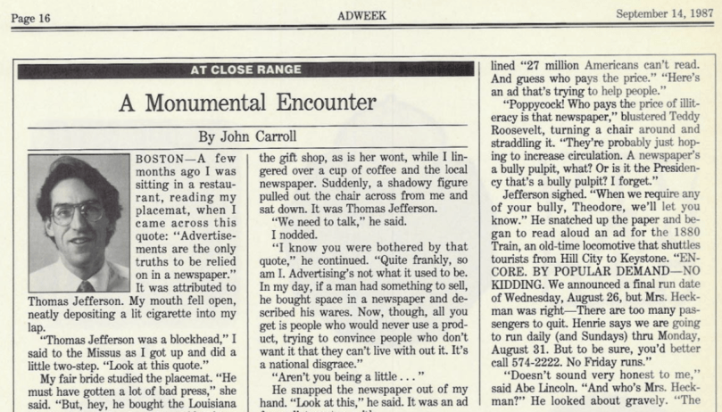 In 1987 I was a very unhappy creative director at a mid-sized ad agency in Boston (representative samples of my work here), when my boss decided it would be a good idea to get me out of town – specifically for a pricey road trip (on his dime) down the California coast.