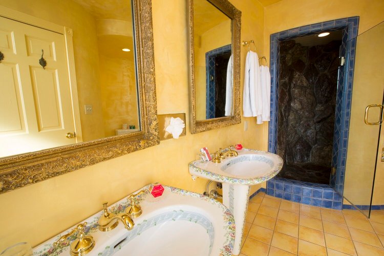 Then the bathroom combined delicate French floral pedestal sinks with a discomfiting craggy, rock shower in jet black. It had malevolent rather than outdoorsy vibes once inside.