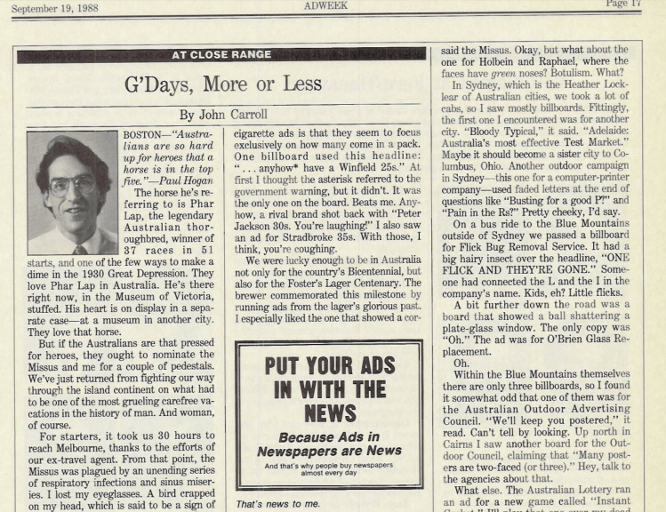 Here’s how I started my Adweek column about the Australia trip the Missus and I took in the fall of 1988.
