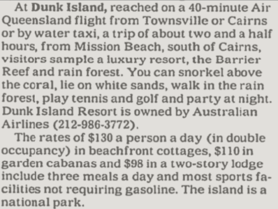 From Cairns we flew on a twelve-seater plane to Dunk Island, described this way in a January, 1988 New York Times piece.