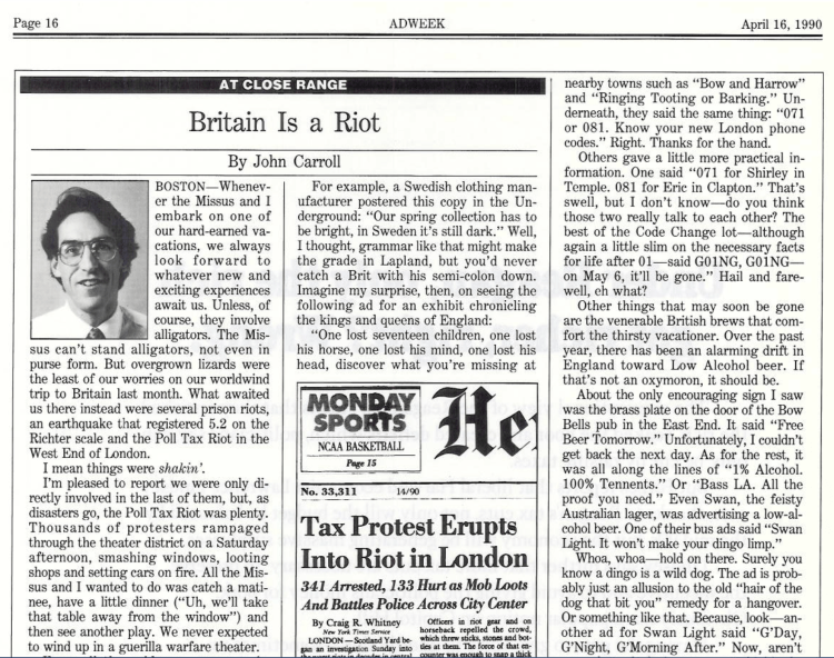 And so it came to pass that the Missus and I were at a matinee performance of (I’m pretty sure) “Man of the Hour” (totally sure the production featured a swimming pool at the front of the stage) on the last Saturday in March of 1990 when all hell – a.k.a. the Poll Tax Riots – broke loose. The London edition featured thousands of protestors rampaging through the West End, smashing windows, looting shops, and setting cars on fire.