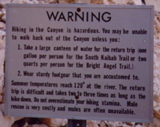 Also like legions of others before us, we wanted to see the canyon up close. So bright and early the next morning, we headed down the nearest hiking trail. We’d gone maybe a third of a mile when we encountered a sign similar to this one.