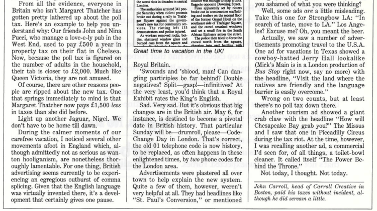 The lede of my October 1989 Adweek column told the tale of our first trip to Ireland.